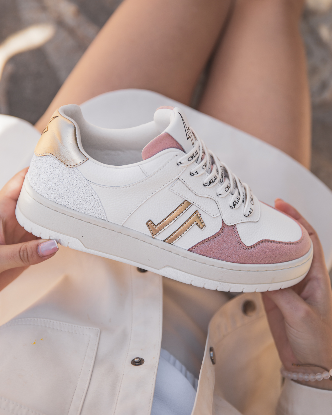 BASKETS BLANCHE ROSE DORE-LACETS IMPRIMES