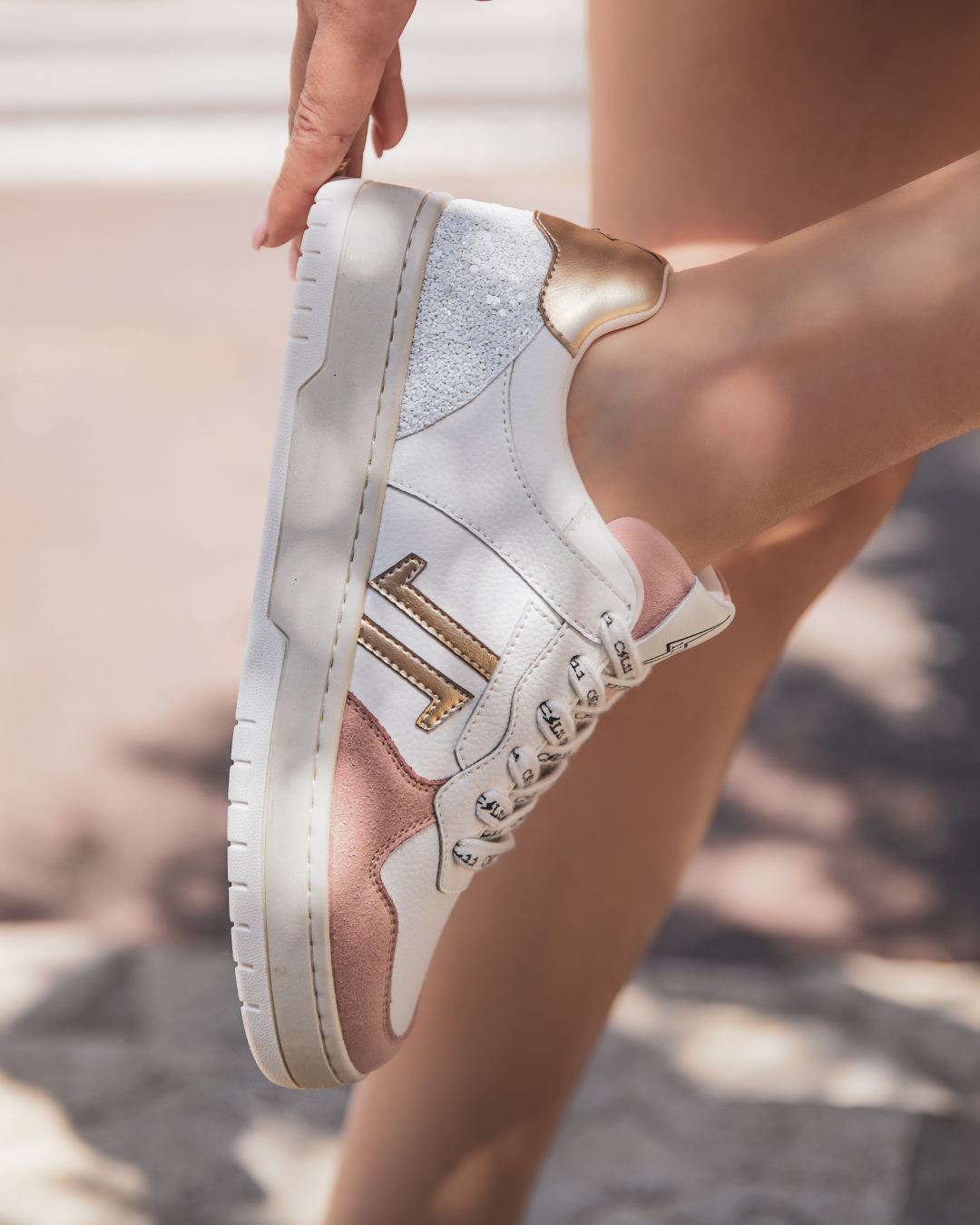Ajoutez une touche de douceur à votre style avec ces baskets blanches ornées de détails dorés et roses. La fermeture à lacets assure un ajustement parfait et confortable. Parfaites pour une tenue décontractée ou chic, ces baskets sont idéales pour les femmes recherchant une combinaison de confort et d'élégance. Ces chaussures polyvalentes complètent parfaitement toutes vos tenues, apportant une note subtile et élégante à votre look quotidien.