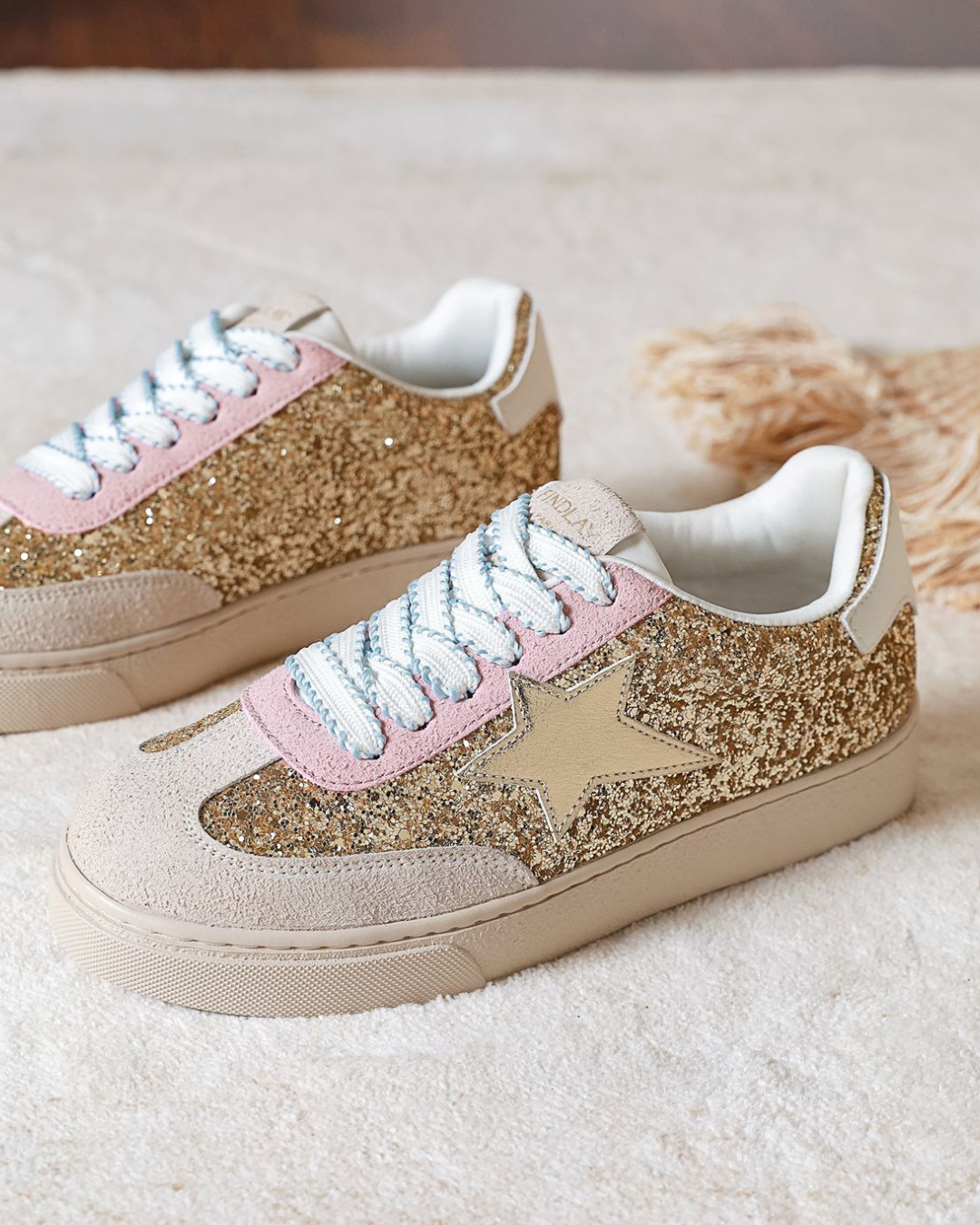BASKETS FEMME PAILLETÉES OR –DÉTAILS ROSE & BLEU