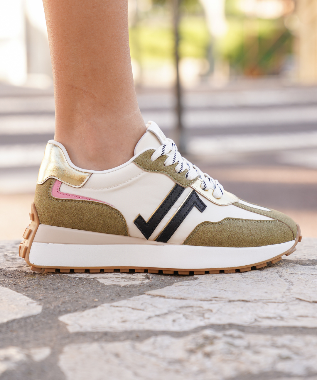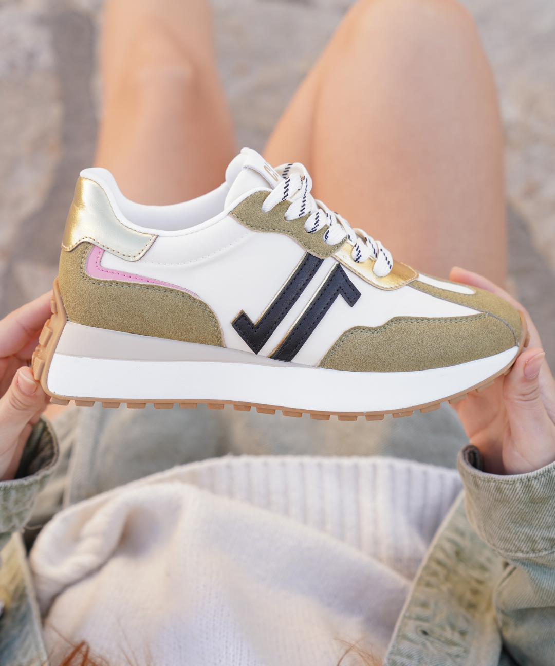 BASKETS FEMME KAKI MODERNES AVEC DÉTAILS OR ET ROSE DISCRET