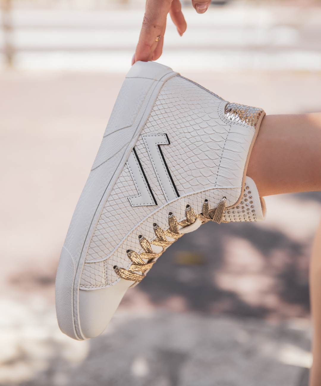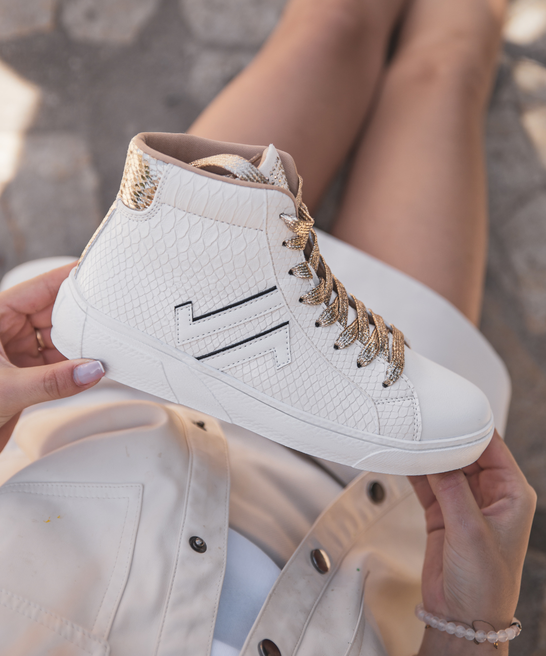 BASKETS FEMME BLANCHES & DORÉES À SCRATCH – DÉTAIL LÉOPARD