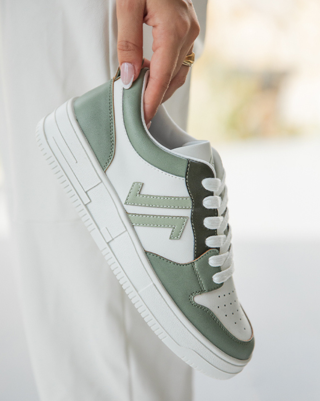 Baskets au design épuré mêlant une base blanche à des empiècements vert sauge pour une allure douce et contemporaine. Les finitions soignées et la semelle épaisse offrent un confort optimal au quotidien. Faciles à associer, elles apportent une touche fraîche et moderne à toutes vos tenues, du look casual au plus habillé.