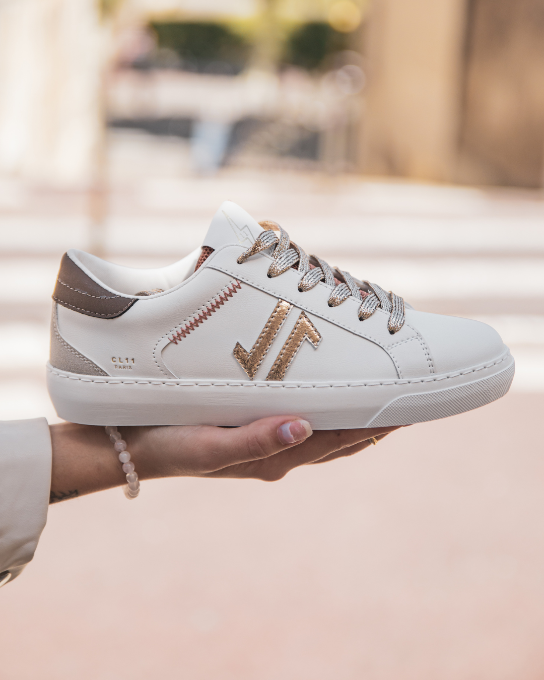 Baskets blanches au style chic et moderne, sublimées par des détails dorés discrets et des lacets texturés pour une touche originale. Les finitions soignées et les surpiqûres contrastées apportent du caractère, tandis que la semelle confortable garantit un usage agréable au quotidien. Un modèle facile à associer, parfait pour un look élégant et décontracté.