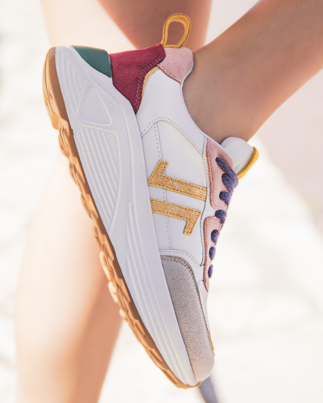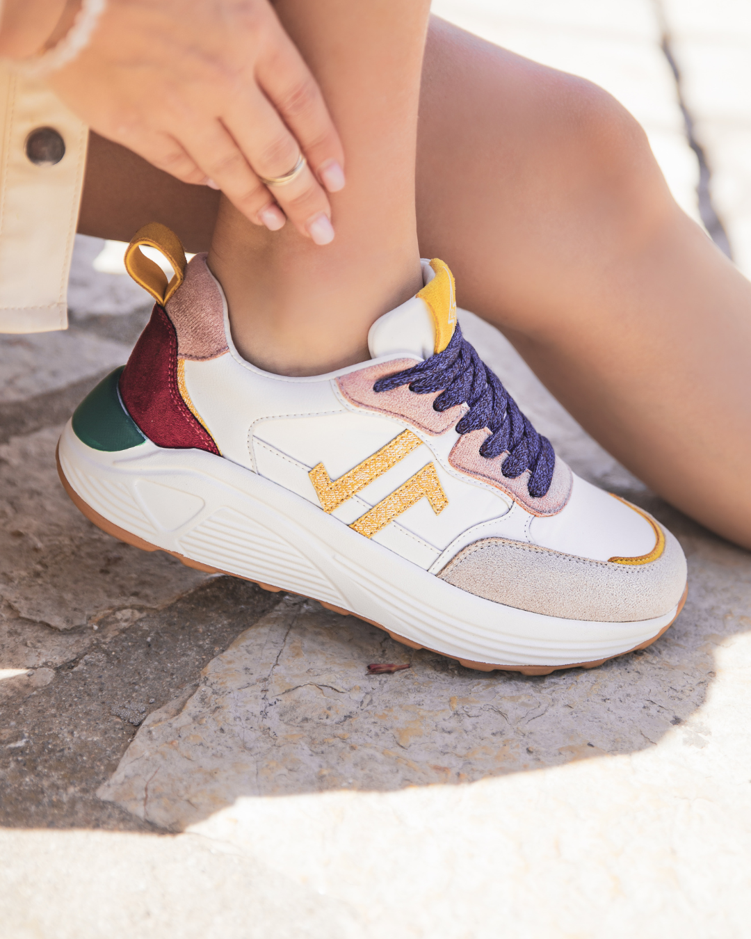 Ajoutez une touche de couleur à votre style avec ces baskets multicolores ornées de lacets violets et de détails jaunes. La fermeture à lacets assure un ajustement parfait et confortable. Parfaites pour une tenue décontractée ou sportive, ces baskets sont idéales pour les femmes recherchant une combinaison de confort et d'originalité. Ces chaussures dynamiques et tendance apporteront une note éclatante à toutes vos tenues, parfaites pour un look audacieux et moderne.