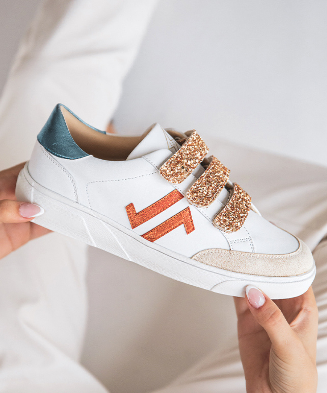 BASKETS BLANCHES À SCRATCHS DÉTAILS PAILLETÉS ORANGÉS
