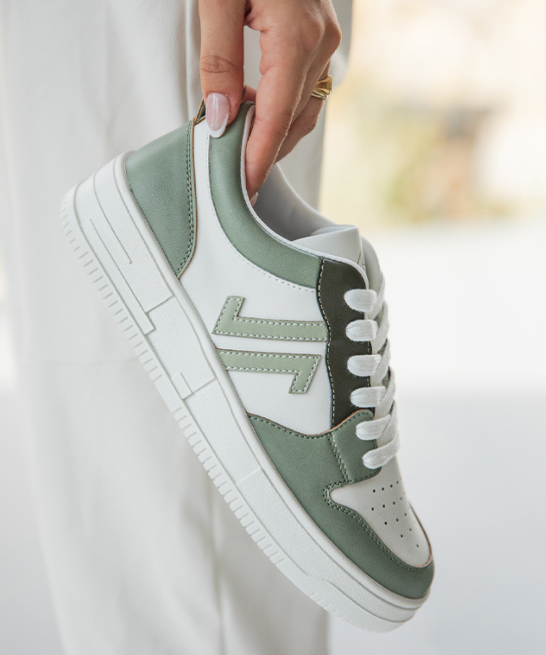 BASKETS BLANCHES ET VERT SAUGE À LACETS